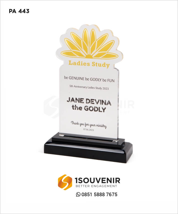 Plakat ini ideal sebagai penghargaan untuk anggota atau pendiri komunitas, atau sebagai kenang-kenangan untuk acara perayaan. Jika Anda tertarik untuk memperoleh atau mengkustomisasi Plakat 5th Anniversary Ladies Study 2023, silakan hubungi customer service kami. Kami berkomitmen untuk menyediakan plakat yang tidak hanya indah secara visual tetapi juga mewakili semangat dan pencapaian komunitas. Kontak kami sekarang untuk konsultasi dan pemesanan, dan buatlah perayaan ulang tahun komunitas Anda menjadi lebih berkesan dan bermakna.