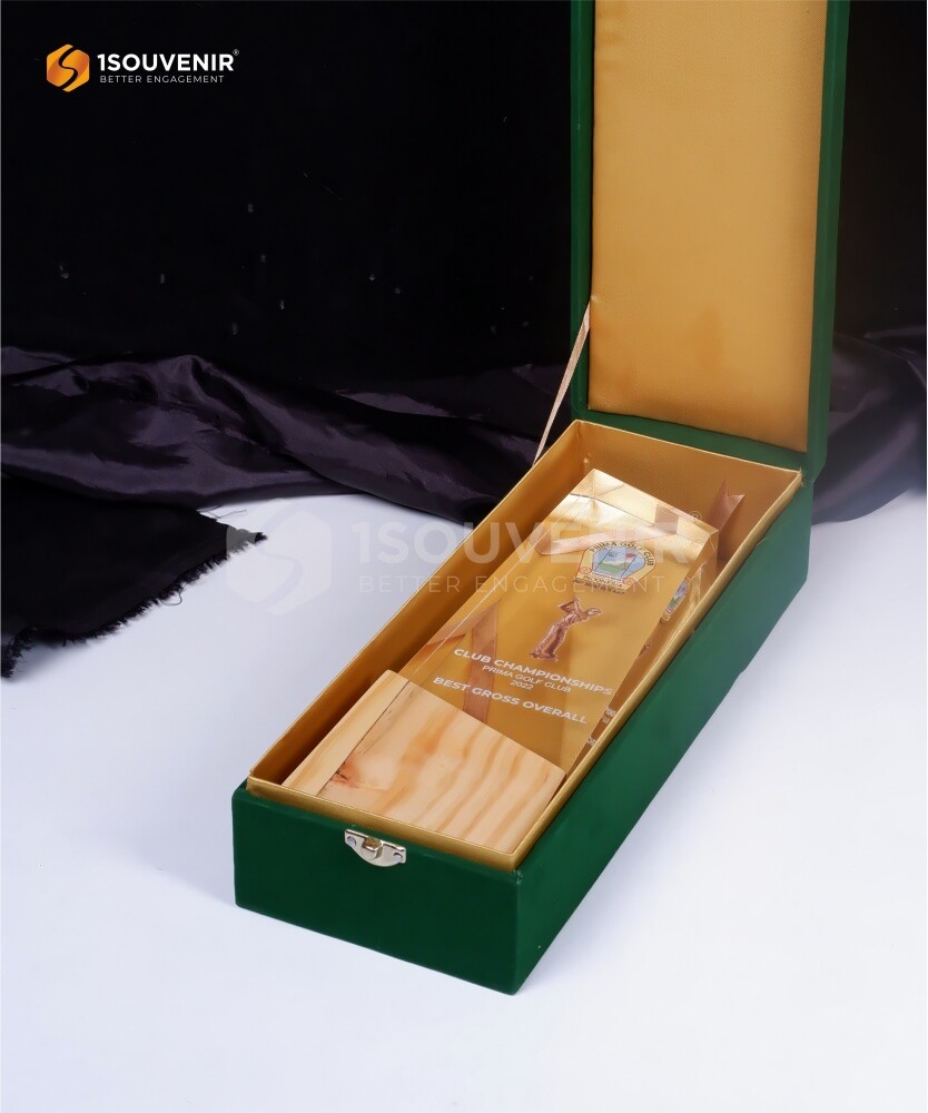 Plakat Akrilik Best Gross Overall Prima Golf Club 2022 ini terbuat dari bahan dasar akrilik bening yang diflatbed dengan alas akrilik hitam. Untuk dudukannya menggunakan bahan kayu dengan warna natural. Dengan desain yang unik seperti ini, souvenir mampu menyampaikan pesan dengan lebih berkesan. Dan dengan memberikan souvenir tersebut, hubungan yang terjalin akan semakin erat.