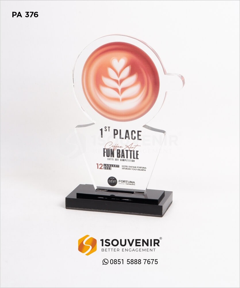 Dengan desain yang elegan dan modern, plakat ini bukan hanya penghargaan, tetapi juga karya seni yang menggambarkan passion terhadap dunia kopi. Jika Anda tertarik untuk memperoleh atau mengustomisasi Plakat Coffee Art Fun Battle untuk acara atau kompetisi Anda, silakan hubungi customer service kami. Kami berkomitmen untuk menyediakan plakat yang tidak hanya unik dan menarik, tetapi juga menggambarkan semangat dan kecintaan pada seni kopi. Kontak kami sekarang untuk konsultasi dan pemesanan, dan buat penghargaan Anda menjadi lebih berkesan dan spesial.