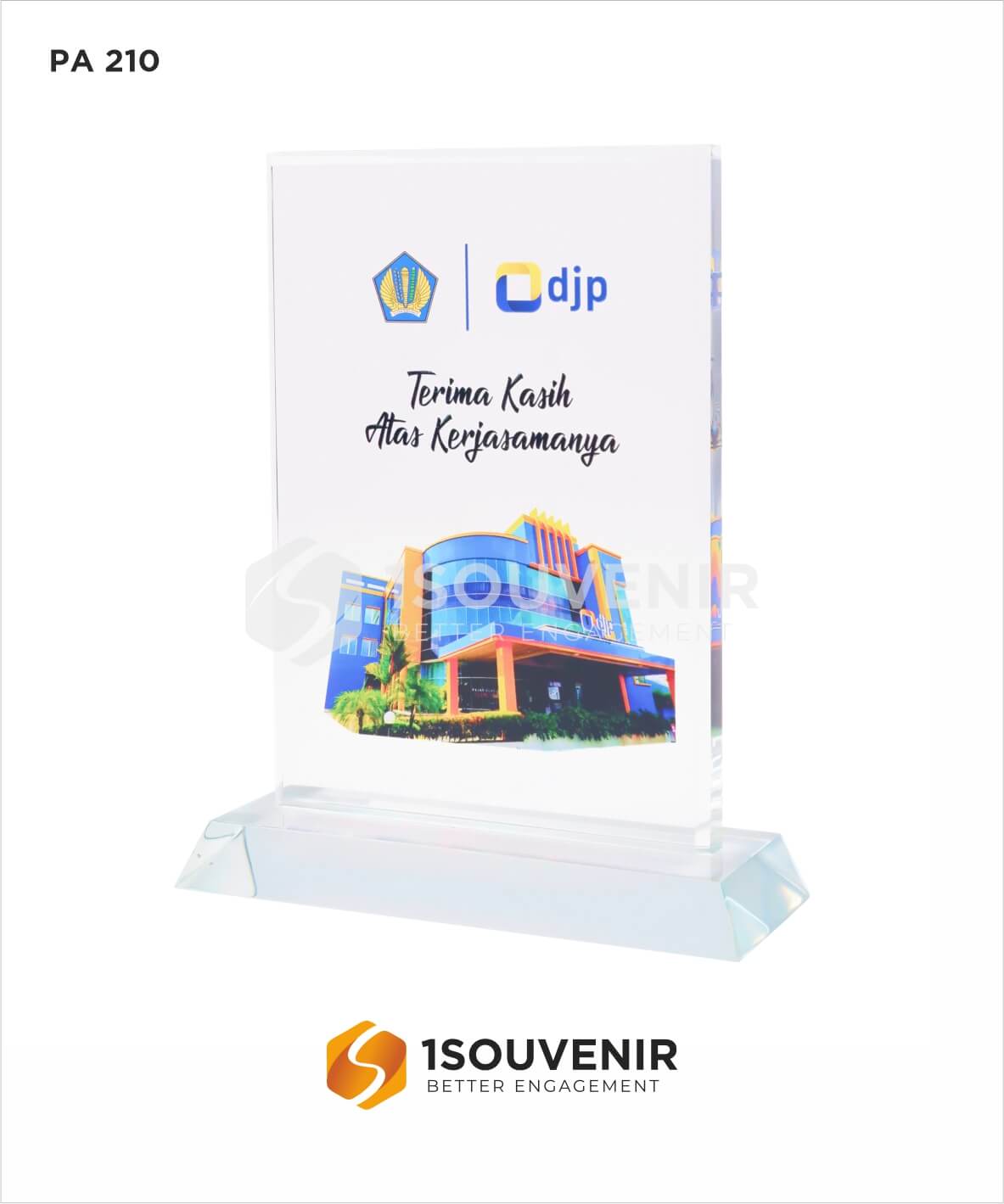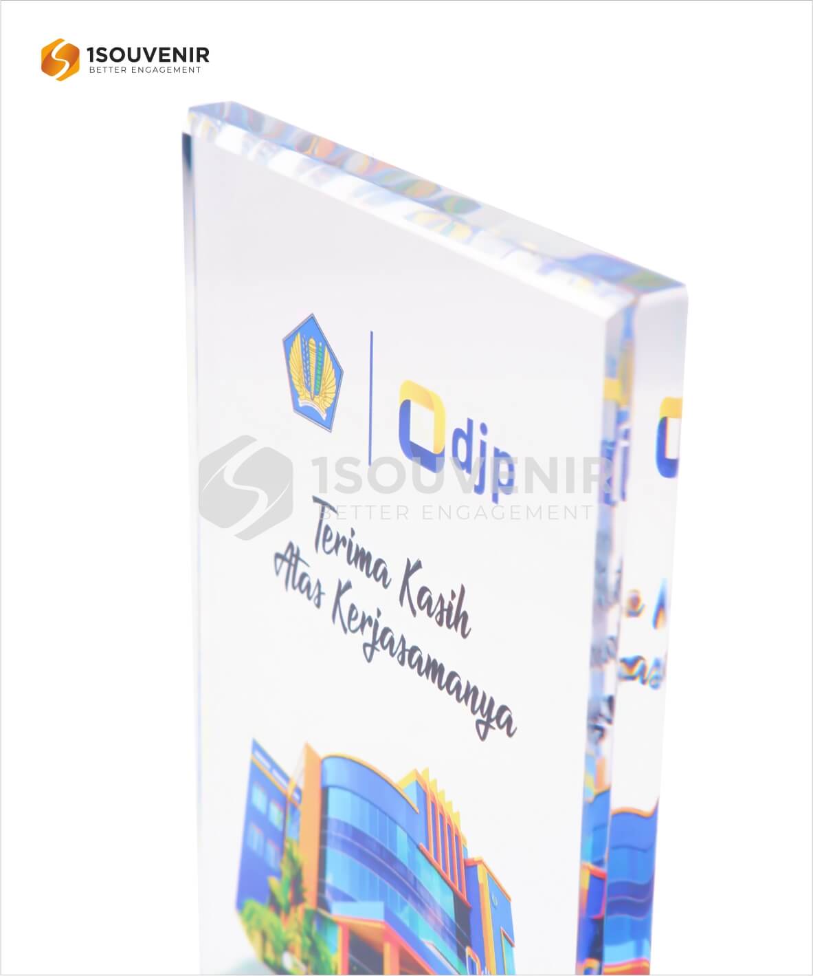 Plakat akrilik DJP ini digunakan sebagai ucapan terimakasih atas kerjasamanya. Plakat ini didesain dengan gambar gedung DJP dan halaman depannya. Gambar ini dibuat dengan metode flatbed.