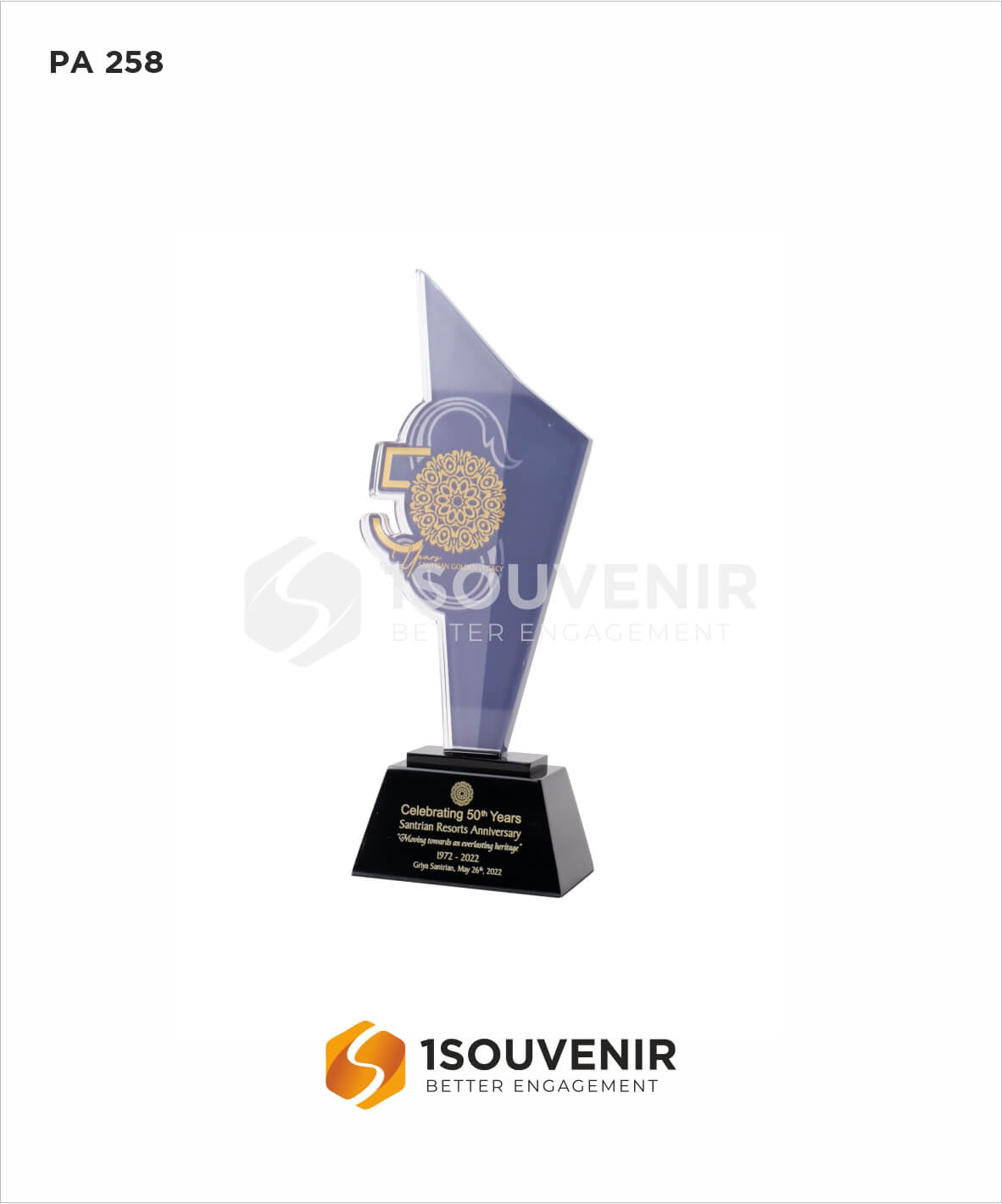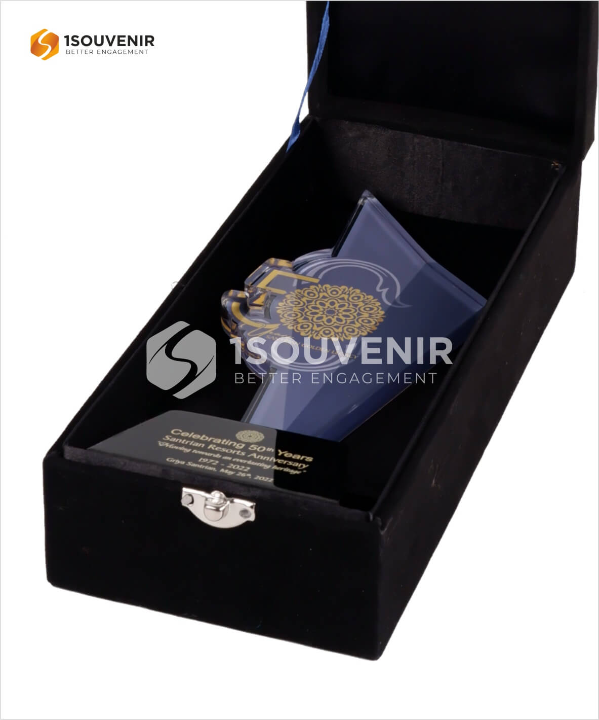 Souvenir dengan kode produk PA 258 ini digunakan untuk memperingati anniversary Griya Santrian Golden Legacy yang ke 50. Griya Santrian Legacy sudah berdiri sejak 1972 sampai 2022 (sekarang). Souvenir ini juga dilengkapi dengan box berlapis beludru hitam dan kain satin hitam.