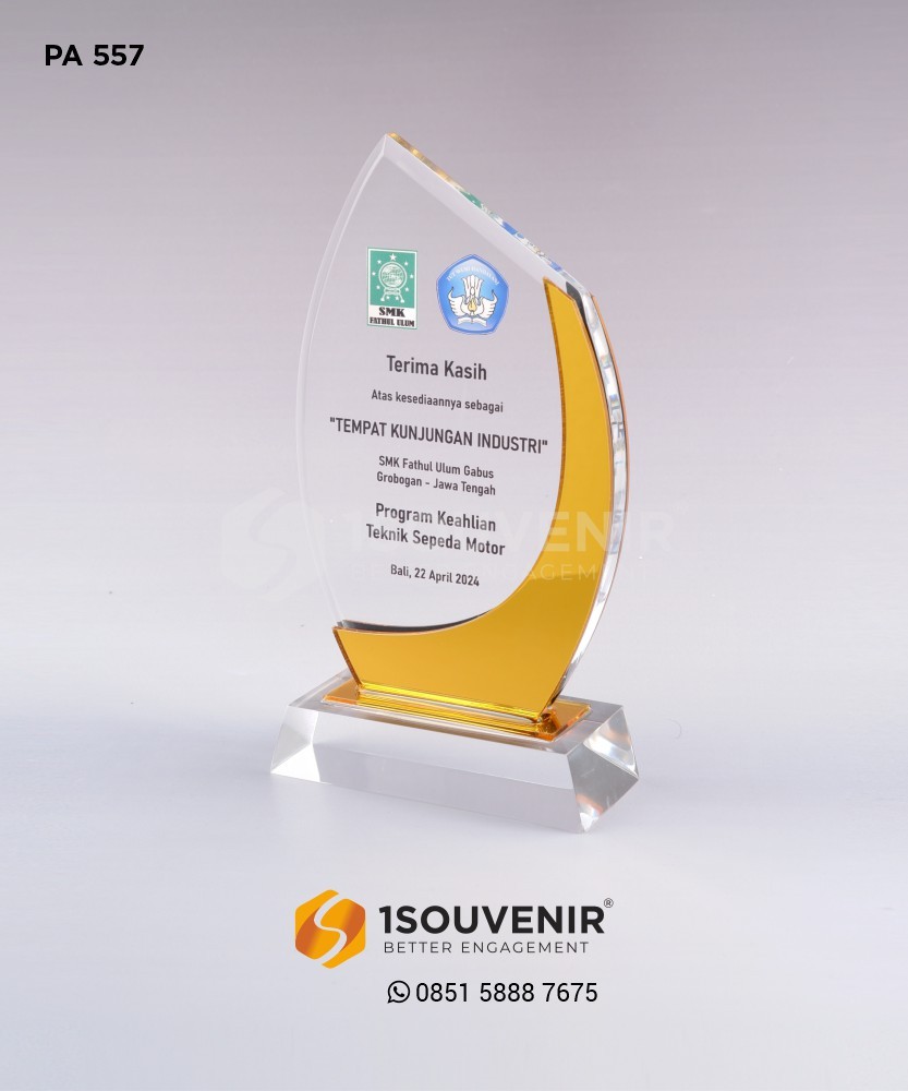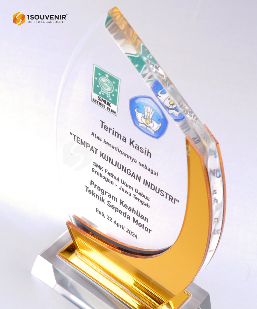 Plakat Akrilik Custom Kunjungan Industri SMK Fathul Ulum Gabus dirancang untuk menjadi kenangan abadi dari momen edukatif yang tak terlupakan. Plakat ini memancarkan kejernihan dan kilau yang menawan. Desainnya yang modern dan minimalis dipadukan dengan logo SMK Fathul Ulum Gabus dan detail kunjungan industri yang tercetak dengan tajam, menjadikannya souvenir yang istimewa.
