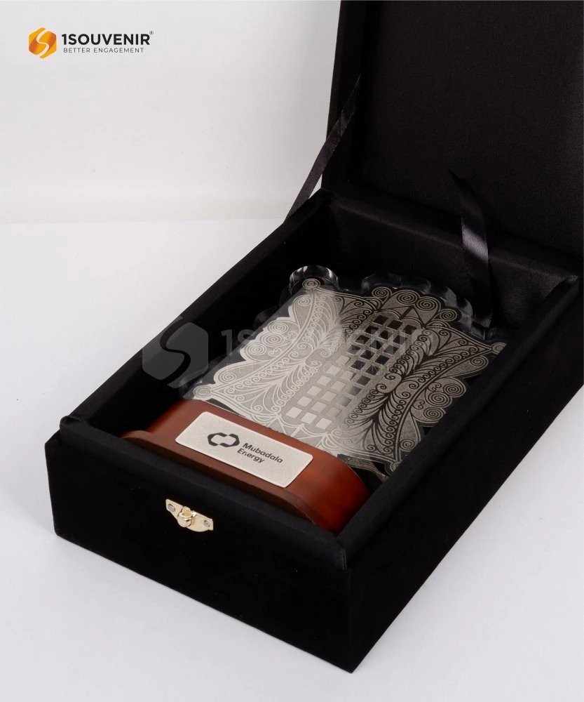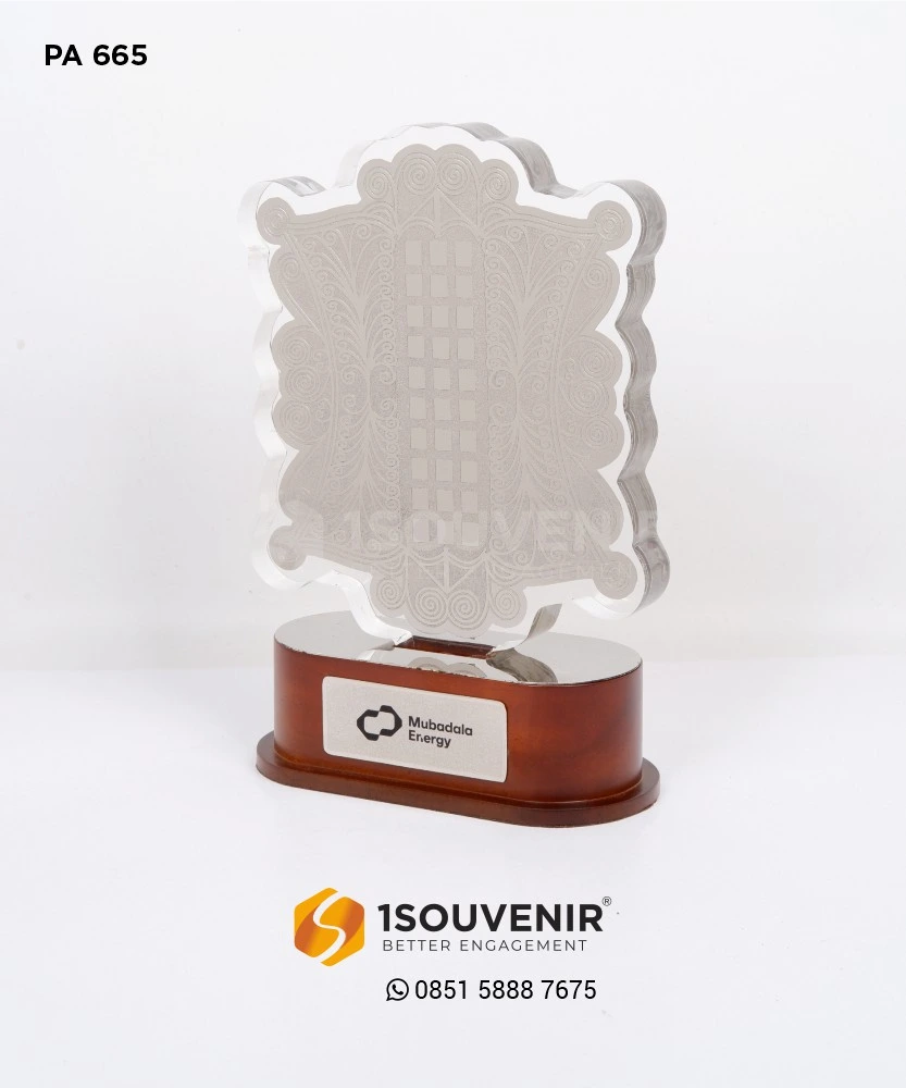 Plakat PT Mubadala Energy ini hadir dengan desain elegan dan unik berbahan akrilik, berpadu dengan base kayu bernuansa hangat. Ukiran motif eksklusif pada bagian akrilik mencerminkan nilai artistik dan profesionalisme tinggi dalam sebuah simbol penghargaan.
