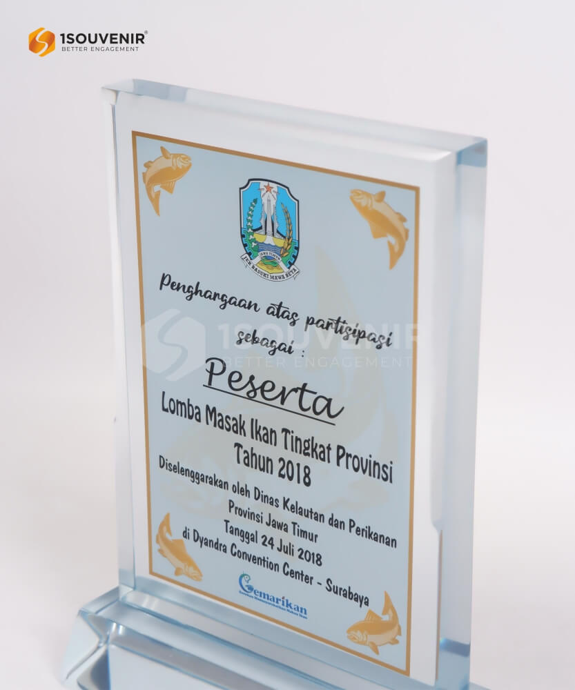 Plakat akrilik Lomba Masak Ikan Tingkat Provinsi ini terbuat dari bahan dasar akrilik bening yang diflatbed untuk menghasilkan gambar pada souvenir. Untuk dudukannya menggunakan resin bening yang disatukan dengan akrilik menggunakan lem. Souvenir yang digunakan sebagai penghargaan mampu menyampaikan pesan dengan lebih berkesan. Dan dengan memberikan souvenir tersebut dapat mempererat hubungan yang terjalin.
