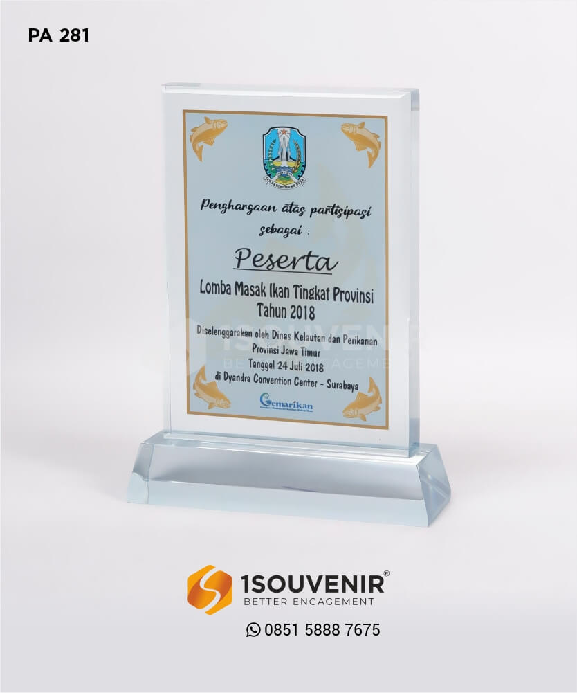 1SOUVENIR telah melayani pemesanan souvenir sejak tahun 2007. Kami selalu memastikan souvenir yang kami buat menggunakan bahan yang berkualitas dan melalui QC (Quality Control). Jika Anda tertarik ingin membuat plakat dengan desain seperti plakat akrilik Lomba Masak Ikan Tingkat Provinsi ini, Anda bisa menghubungi customer service kami.
