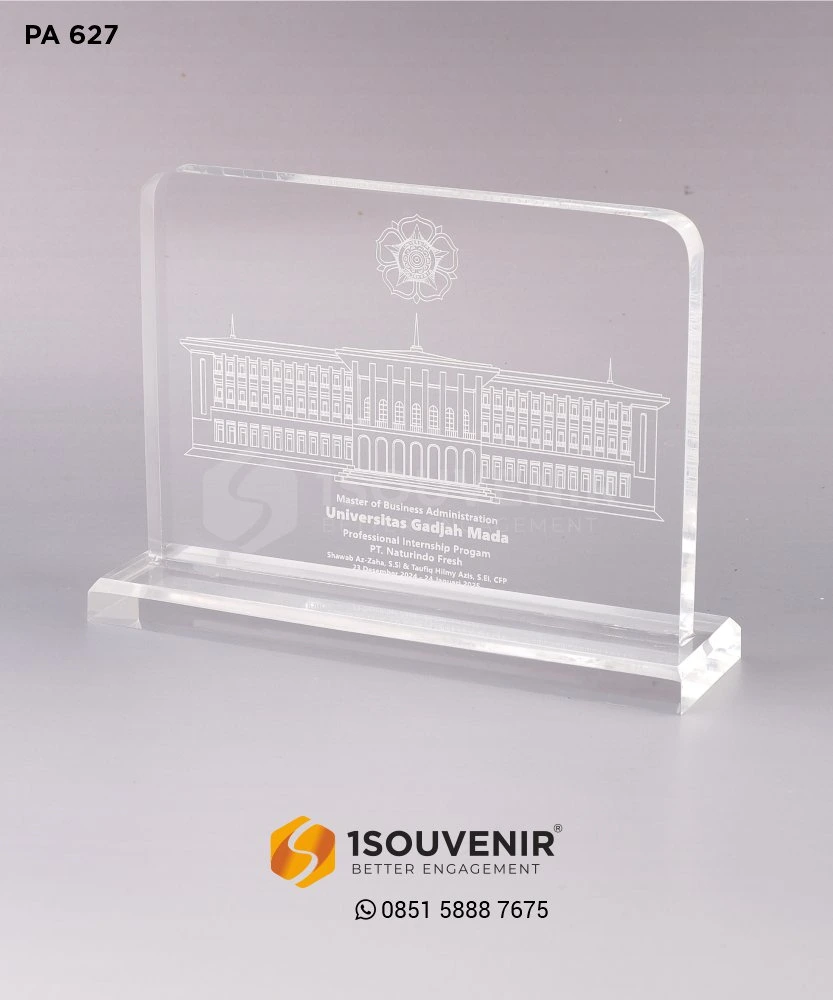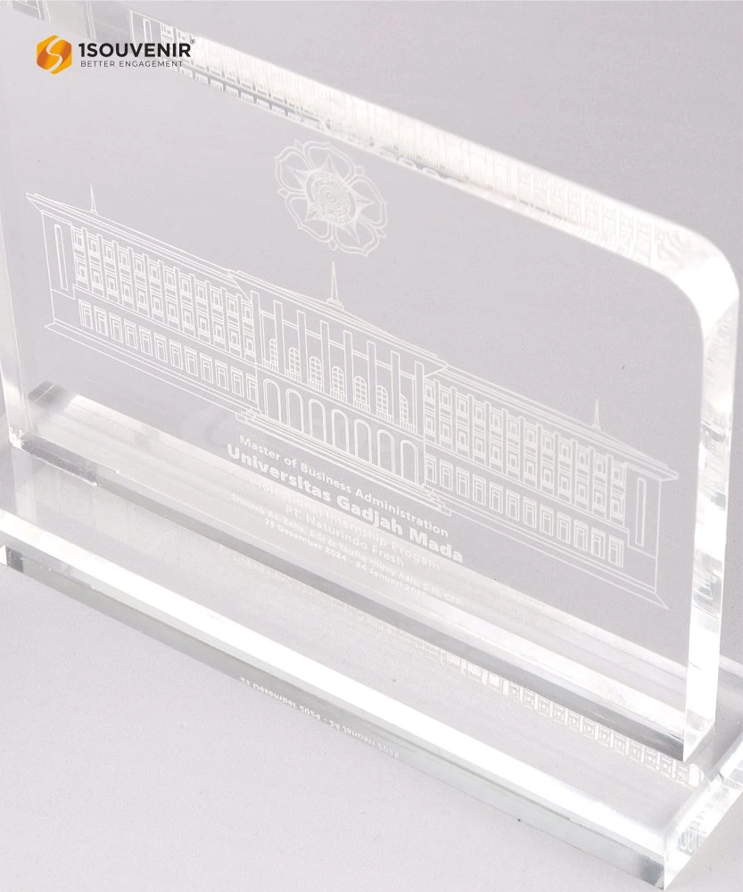 Plakat Master of Business Administration ini merupakan plakat akrilik berkualitas tinggi, menghadirkan desain transparan dengan ukiran detail gedung ikonik UGM. Tampilan elegan dan modern menjadikannya simbol penghargaan yang eksklusif dan bermakna.