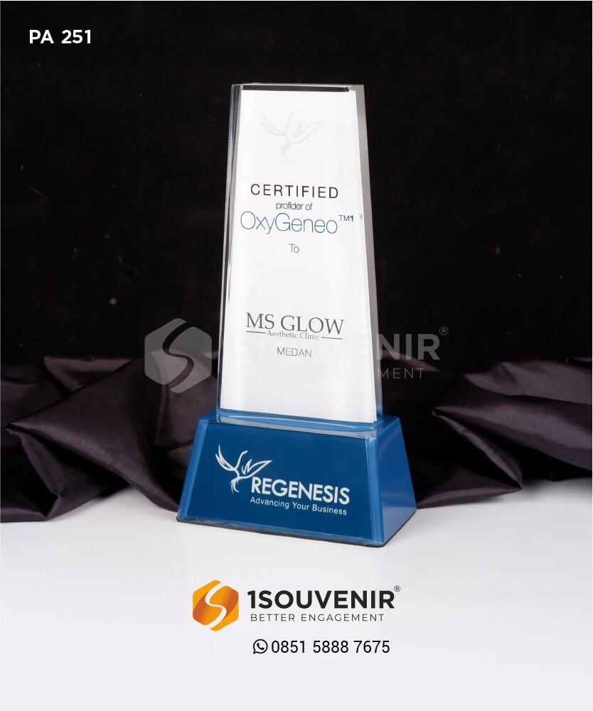 Plakat Akrilik MS Glow – Certified Profider of OxyGeneo To MS Glow Aesthetic Clinic Medan ini terbuat dari bahan dasar akrilik bening yang diflatbed background berwarna putih serta tulisan berwarna hitam dan biru. Untuk dudukannya menggunakan resin biru yang dicor resin bening dengan tambahan flatbed gambar dan tulisan warna putih. Dengan desain yang unik, plakat akrilik custom ini mampu menyampaikan pesan dengan lebih berkesan. Dan dengan memberikan souvenir tersebut, hubungan yang terjalin akan semakin erat.
