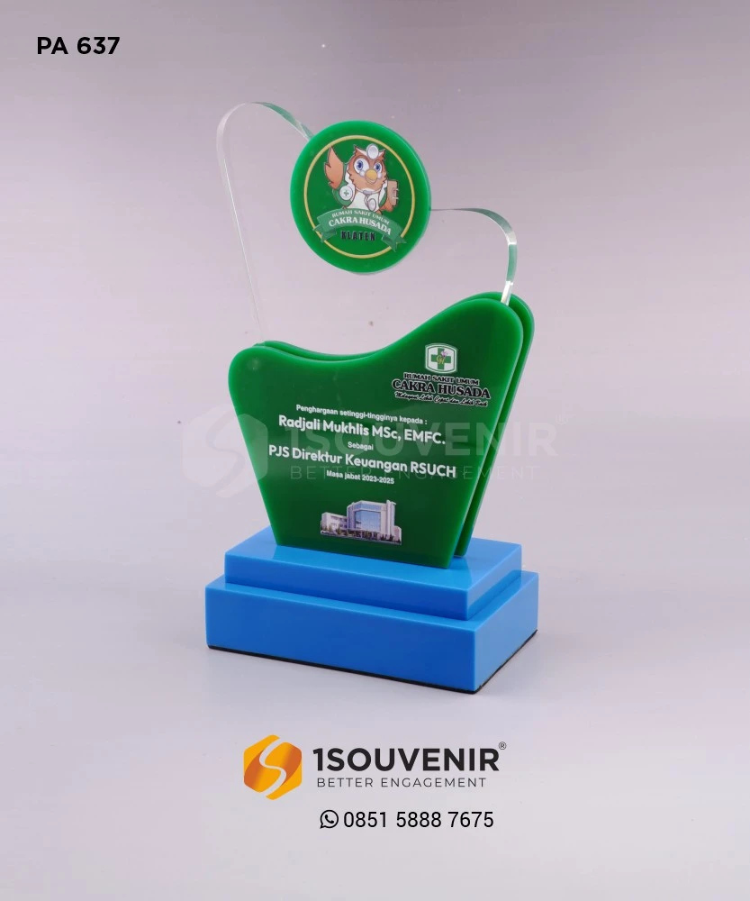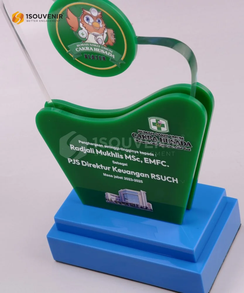 Plakat RSU Cakra Husada ini memiliki desain modern dan warna hijau khas instansinya. Dibuat dari material akrilik berkualitas tinggi, dengan kombinasi bentuk unik yang elegan. Plakat akrilik ini cocok sebagai penghargaan untuk tenaga medis, manajemen, atau apresiasi institusi kesehatan.