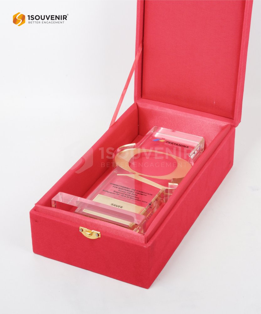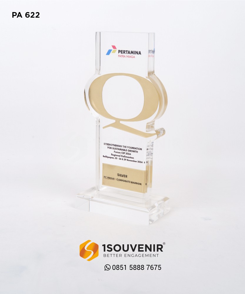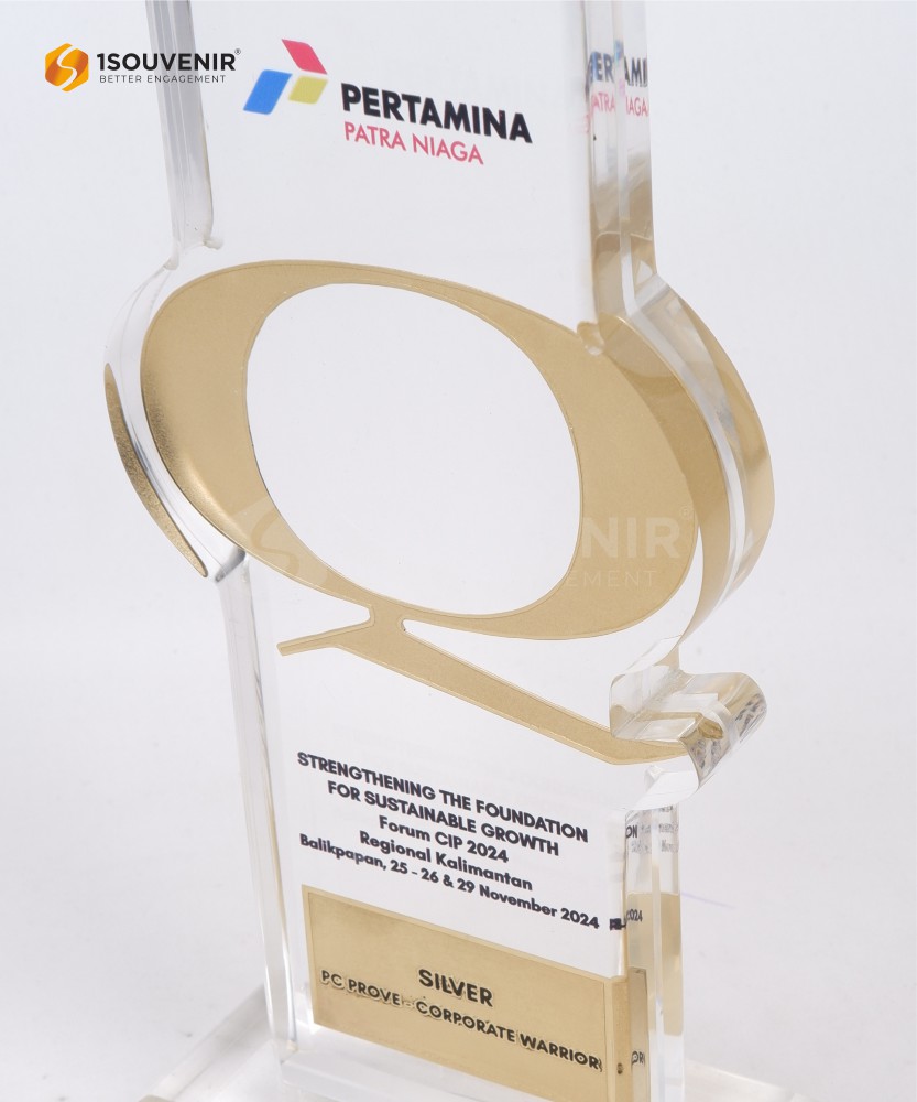 Plakat Q Pertamina ini terbuat dari bahan akrilik berkualitas tinggi, dengan desain modern dan elegan. Dibalut dengan warna emas yang kontras, plakat ini memberikan kesan mewah sekaligus profesional. Sebagai plakat akrilik, ia memiliki ketahanan yang baik dan dapat menjadi simbol penghargaan yang tak lekang oleh waktu.