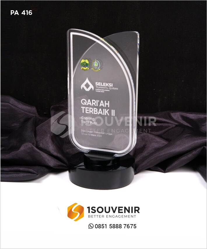 Plakat Qariah Terbaik Seleksi Tilawatil Quran adalah plakat akrilik custom yang dirancang untuk memberikan penghargaan kepada qariah yang menunjukkan prestasi luar biasa dalam kompetisi Tilawatil Quran. Plakat ini menampilkan desain yang anggun dan spiritual, dengan motif-motif Islami yang diukir secara detail dan halus pada akrilik berkualitas tinggi. Tampilannya yang menginspirasi dan penuh keindahan menjadikan plakat ini simbol kecemerlangan dalam seni membaca Al-Quran.