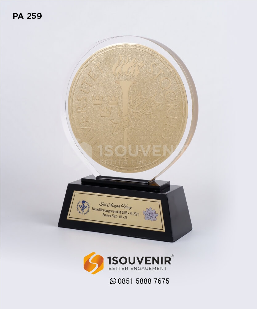 Plakat akrilik Stockholms Universitet merupakan plakat  yang digunakan sebagai penghargaan kepada para maha siswa yang telah melaksanakan ujian. Plakat ini terbuat dari bahan dasar akrilik bening dengan akrilik hitam dan dikombinasikan dengan logam etsa masir berbentuk logo Stockholms Universitet. Dengan desain yang elegan ini, souvenir mampu menyampaikan pesan dengan lebih berkesan. Dan dengan memberikan souvenir tersebut dapat mempererat hubungan yang terjalin.