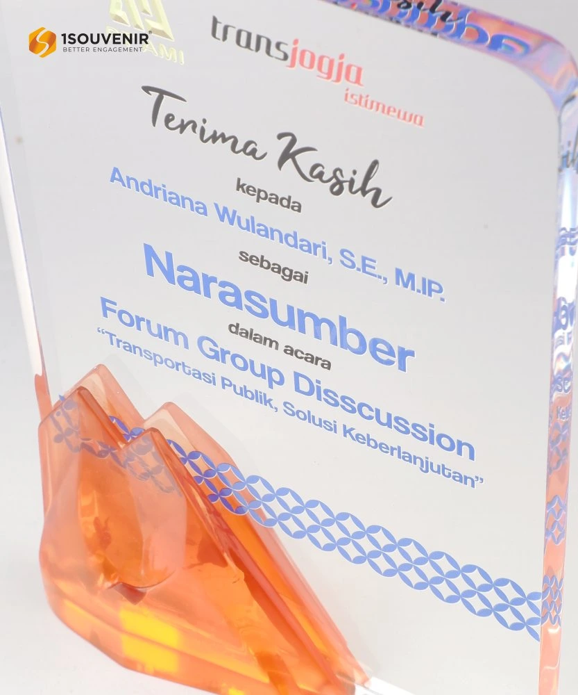 Plakat Forum Group Discussion ini merupakan plakat akrilik premium dengan desain modern dan elegan. Kesan transparan dan bentuk geometris di bagian dasar memberikan nilai estetika sekaligus profesional, sangat cocok sebagai bentuk apresiasi & ucapan terima kasih untuk para narasumber.